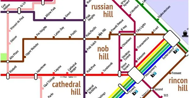克拉德尼故意参考了城市地铁地图的设计,因为他相信如果人们认为骑自行车和乘坐火车一样简单,他们更有可能骑车。“需要从市中心到伯纳尔高地吗?只需跟随蓝线,”他说。“这种简单性将重新定义现有的旧金山自行车道为旧金山自行车系统,并将帮助说服更多人骑上自行车,走上街头。”