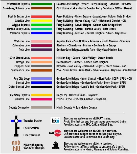 他希望这张新地图能促使旧金山交通局规划更多的自行车基础设施改进。一个建议是:为什么不在地图的每个类似地铁的“站点”中放置颜色编码的自行车架呢?“这些站点将沿着每条路线分布,不仅为骑自行车的人提供重要的基础设施,还提供了一条易于跟随的路径,”他说。