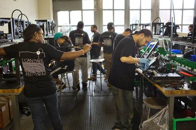 MakerBot Industries 在纽约布鲁克林的 3D 打印机工厂。摄影:Victor J. Blue/BloombergBre Pettis 是他所在街区第一个拥有 Apple II 电脑的孩子。这个设备很吸引人,尽管它几乎没有实际用途,但他所有的邻居朋友们都对它进行了无休止的尝试。Pettis 后来创办了 3D 打印公司 MakerBot Industries,他以同样的眼光看待其产品:它们起初可能看起来很傻,但孩子们会弄明白它们的用处。