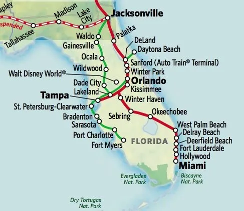 佛罗里达全员上车在地面交通方面,佛罗里达是一个以公路为主的州。铁路的地位远远落后,几乎不值得称其为第二。奥兰多和迈阿密之间的旅程在美铁的银流星号上需要将近6小时,而在银星号上则需要7.5小时,这两者都需要穿越州境并返回才能在中途到达坦帕(如下图,红色部分)。相比之下,驾车旅行只需3小时即可通过一条州际公路。