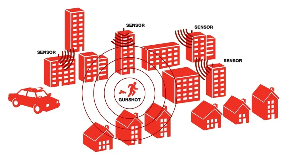 顶部图片:ShotSpotter 的户外技术工作原理的可视化。室内系统将不依赖于三角测量。