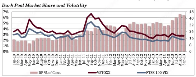 根据Rosenblatt Securities的计算,九月份每天在19个由市场研究公司跟踪的暗池中,平均有38亿欧元的交易额。这大约占九月份欧洲每日590亿欧元交易额的6.4%。通过更广泛的估计,包括一些不向他们报告的池,Rosenblatt将欧洲的暗池活动估计在10.8%到11%之间。在2010年,暗池活动接近欧洲交易价值的2%。