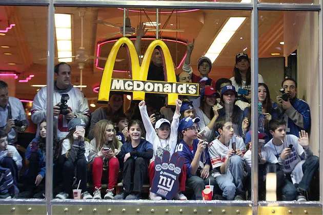 人们在2012年2月7日从麦当劳的窗户观看纽约巨人队的胜利游行摄影:安德鲁·伯顿/盖蒂图片社麦当劳利用快乐餐和其在儿童广告中的巨大主导地位来推广各种产品,从 凯蒂猫和热轮到其自己的 书籍。现在,这个国家最大的汉堡连锁店与全国最受欢迎的职业运动——那就是国家橄榄球联盟——合作推出32个基于 NFL Rush Zone,的玩具,这是一档即将进入第三季的尼克儿童频道的电视节目。
