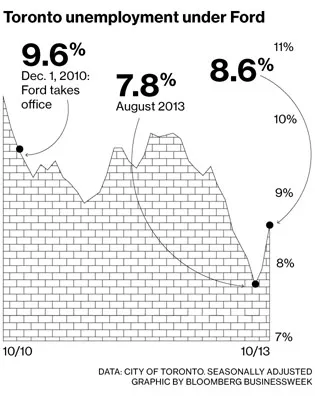 在2010年,福特主要凭借“停止养肥官僚”的竞选承诺赢得了选举,他认为这些被宠坏的官僚、奢侈的市议员和市政工会都在榨取城市的生命线。他是最后一个愤怒的人,尊重纳税人辛苦挣来的每一美元,并触动了那些被城市快速发展抛在后面的人们的挫败感。对许多人来说,住房价格荒谬地昂贵,通勤时间极其漫长,购房者厌恶福特的左翼前任大卫·米勒为减少城市赤字而实施的土地转让税。福特承诺降低物业税,削减城市开支,限制工会的权力,并为城市带来财政纪律和私营部门的专业精神,所有这些都不削减城市服务。