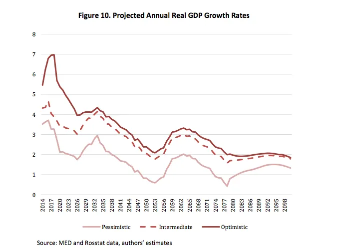 现在又一项经济研究,预计到2100年左右,表明整个21世纪俄罗斯可能会面临低于平均水平的增长。一组来自盖达尔经济政策研究所和俄罗斯国家经济与公共行政学院的经济学家表示,尽管官方统计数据显示政府财务状况良好,俄罗斯已经面临严重的财政挑战。