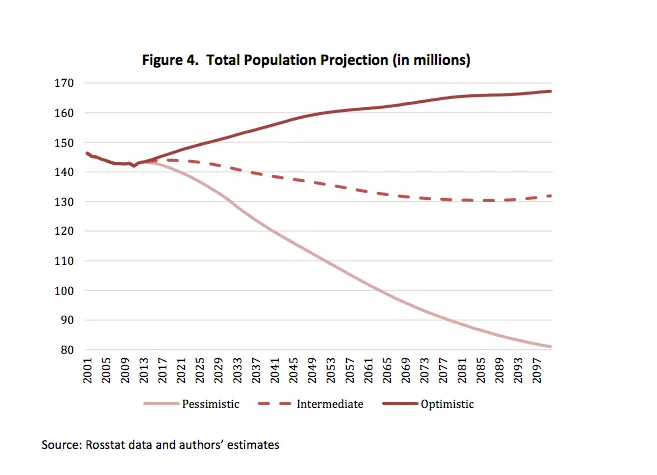 4. 消费者减少。 俄罗斯整体预计人口下降——除非你相信下一个图表中的乐观情景——这将意味着潜在消费者减少。