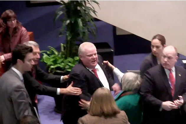 多伦多市长罗布·福特在11月18日市政厅的视频截图中被拍到在向市议员帕姆·麦康奈尔冲去时将其撞倒照片由Paola Loriggio/加拿大新闻社通过美联社照片提供多伦多的悲喜剧市长罗布·福特本周可能以一记值得枫叶队称赞的 身体检查结束了六个月的政治自我焚烧。这次碰撞发生在市政厅的一次喧闹会议上,该会议剥夺了福特超过一半的办公室预算(使他名义上仍为领导者),在会议期间,他还设法将自己与科威特被萨达姆·侯赛因的伊拉克入侵进行比较。尽管如此,大家喜欢开玩笑的笨拙政治家仍誓言留任,继续为纳税人而战。