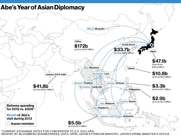 安倍是一位外交政策鹰派,与中国在一些日本控制的岛屿的所有权问题上发生过冲突,他希望巩固与环绕中国的国家的关系。一些国家也有自己的争端,包括与中国有争议边界的印度。安倍明年将访问印度,并将在12月中旬接待东盟领导人。这都是他阻止中国统治者的运动的一部分,正如他在去年12月的一篇专栏中所写的那样,中国将南海视为“北京湖”。