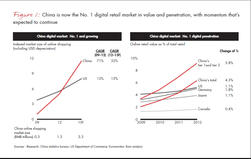去年,中国消费者在线消费了1.3万亿元人民币(2130亿美元),略低于2250亿美元的美国总额。根据贝恩公司的预测,自2009年以来,中国在线零售市场以71%的惊人复合年增长率增长,约为其美国同行的五倍。