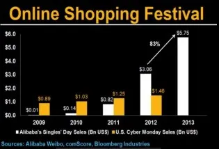 双十一已成为中国一个史诗般的电子商务盛事,并且对于互联网公司来说,其收入远远超过美国的网络星期一。阿里巴巴集团控股,中国最大的电子商务公司,在今年的双十一当天打破了单日销售记录,超过了80%的增长,这一里程碑出现在预计在2014年某个时候进行的首次公开募股之前,该募股的估值可能高于脸书。阿里巴巴尚未宣布该募股的时间表。
