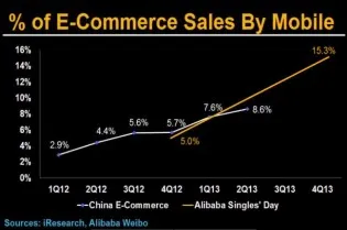 截至今年第二季度末,中国约有8.6%的电子商务交易是通过手机完成的。在双十一,一个在11月中旬的中国节日,是情人节的本土变体,也是一年中最大的在线购物日,15.3%的所有交易是在移动设备上进行的。