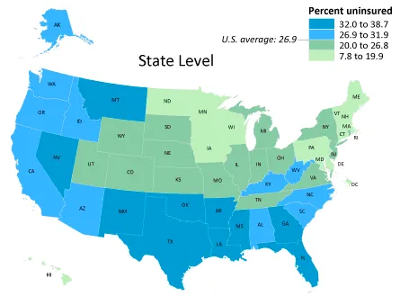 南方的一些绿色区域也很显著——其中许多是大学城,比如佛罗里达州的盖恩斯维尔和塔拉哈西,以及德克萨斯州的大学城,在这些地方,大量大学生可能仍然在父母的保险覆盖下。