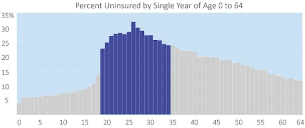 人口普查局医疗改革在很大程度上依赖于使用最少医疗服务的人群:即年轻健康的成年人,直到现在,他们根本没有考虑购买保险。这个年龄在19到34岁之间的群体,在美国的无保险人口中占比最高: