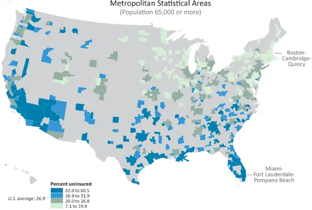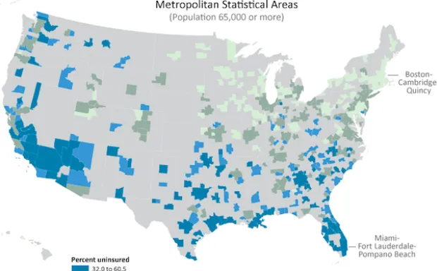 波士顿和迈阿密/劳德代尔堡地区之间的差异尤其明显。在全国25个最大的大都市区中,波士顿的年轻成人无保险率最低,这得益于马萨诸塞州的医疗保健法(7.9%)。在迈阿密,41%的19至34岁成年人没有保险。