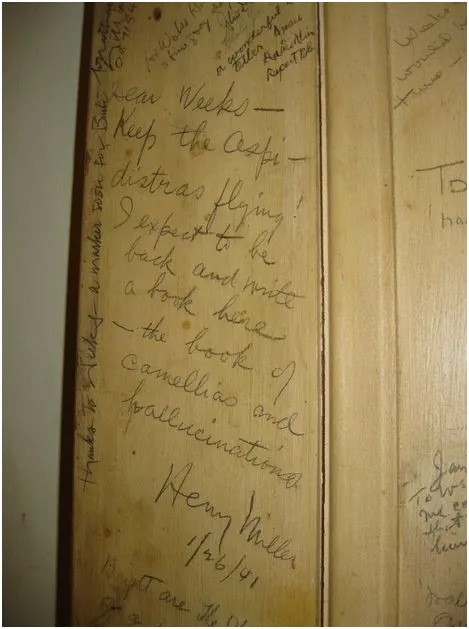 令人失望的是,迪士尼没有用 Waltograph 字体书写,但他作为一个原始涂鸦者的事实仍然很酷。门上还有来自埃利亚·卡赞的赞美,他是 欲望号街车 和 在港口 的导演,他写道Shadows是“我在南方见过的最美丽的房子。”看看——这是作家亨利·米勒的神秘而奇怪的留言(“aspidistras”可能指的是一种开花的亚洲 植物):
