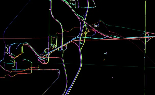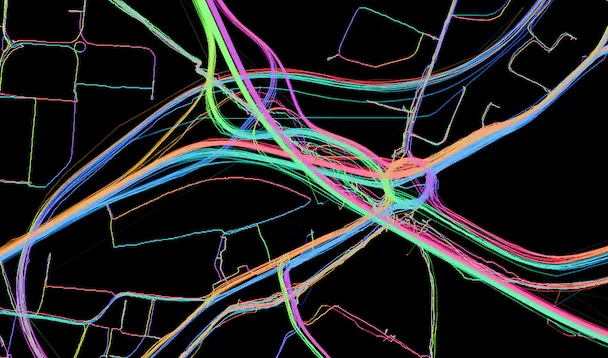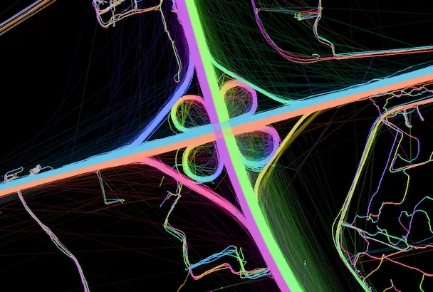彭博社城市实验室芝加哥应考虑所有预算危机的解决方案,普利兹克说消除美国道路死亡的月球计划AOC提议300亿美元的社会住房管理局纽约市交通系统计划为大中央车站和地铁进行654亿美元的升级那张图片来自于 开放街图上的GPS轨迹,现在可以可视化这个开源地图项目庞大、不断更新的GPS数据库。这些轨迹来自个人贡献者,通常是自己开车,通过智能手机上的应用程序创建自己的数据流。这些数据可以纠正不准确的地图或验证早期的编辑。但GPS数据也产生了一个指南针副产品:利用它,我们可以验证从移动汽车捕捉到的单行道的方向,或以一种从卫星照片无法实现的方式解开四向叠加立交桥的复杂逻辑。