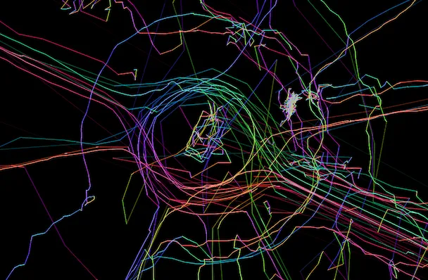 忘掉旧的两色交通图:红色代表尾灯,白色代表前灯。这张地图,感谢 MapBox 和 OpenStreetMap Foundation,用完整的色轮描绘了移动的GPS轨迹。参与该项目的埃里克·费舍尔通过电子邮件这样解释了这个方法: