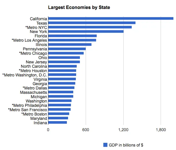 这份最新报告也对大都市区进行了排名。但这更有趣。下面,我们绘制了该报告中最大的州和国家的数据(您可以查看 所有363个美国大都市的完整列表;跳到最后,佛罗里达州的棕榈海岸与东帝汶相比相当不错)。所有数字均以2012年的美国国内生产总值十亿美元为单位。