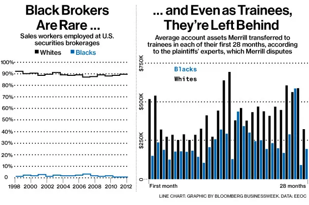 1974年,平等就业机会委员会起诉梅里尔,当时最大的经纪公司,因种族和性别歧视。该公司承认没有过错,达成和解并签署了一项同意令,承诺将黑人经纪人的招聘比例从略高于1%的劳动力增加到6.5%。当协议在1995年到期时,梅里尔仍未达到这一目标。