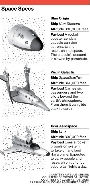 Xcor总部位于加利福尼亚州莫哈维,计划于2014年底开始其 Lynx 太空船的商业飞行。维珍银河的 SpaceShipTwo 将从其在新墨西哥州拉斯克鲁塞斯总部建设的太空港起飞。这两种飞行器看起来有点像航天飞机和喷气式飞机的结合体。成立十四年的Xcor已与三菱重工签署协议;一个名为“公民在太空”的团体,已购买了10次面向普通人的飞行;以及 联合利华,计划将23人送入太空,以推广其Axe系列身体喷雾和除臭剂。维珍表示,它只是在等待12月最后几次测试飞行的结果和一些最终的监管障碍,以开始其商业飞行。