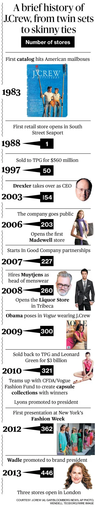 德雷克斯勒所提到的J.Crew并不算新;它也非常是珍娜·莱昂斯的作品。德雷克斯勒在2003年接任CEO,并从相对默默无闻中挑选莱昂斯来负责所有设计(她自1990年起就在公司工作),并在2007年将她提升为创意总监。在45岁的莱昂斯的领导下,J.Crew已成为一个意想不到的时尚力量。她的风格——经典单品、鲜艳色彩和更响亮、常常闪亮的装饰的奇特混合——在从Gap到Vogue的页面上都被模仿。编辑安娜·温图尔是她的粉丝,米歇尔·奥巴马也是,自2012年以来,J.Crew在纽约时装周上展示其系列。J.Crew的价格高于快速时尚连锁店如Zara和H&M,但低于亚历山大·王和汤姆·布朗等设计师品牌,J.Crew找到了一个有利可图的细分市场,成为年轻购物者的理想目的地,以及寻求衣橱必备品的富裕顾客的首选商店。“我不想冒险显得傲慢,但我认为我们所做的很多事情与美国的情感产生了联系,”德雷克斯勒说。