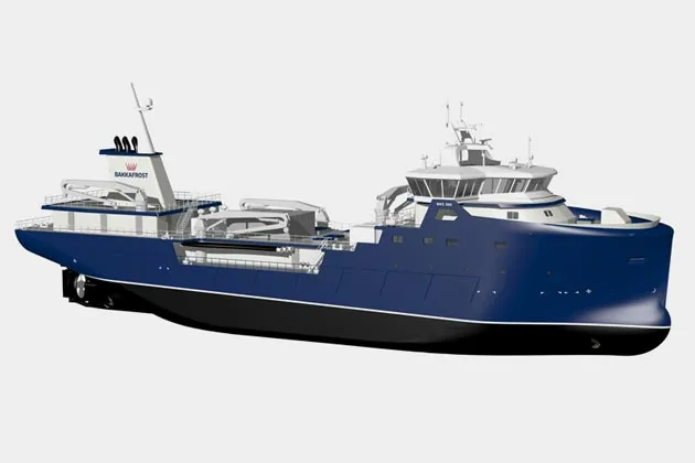 这艘船只,是一艘250英尺的方形“活鱼运输船”,具有高波浪穿透船头,将为丹麦鲑鱼生产商Bakkafrost建造。这艘船将从开放海洋鱼场运输鲑鱼——以及足够的水供它们游动——到将被加工成鱼片和牛排的工厂。