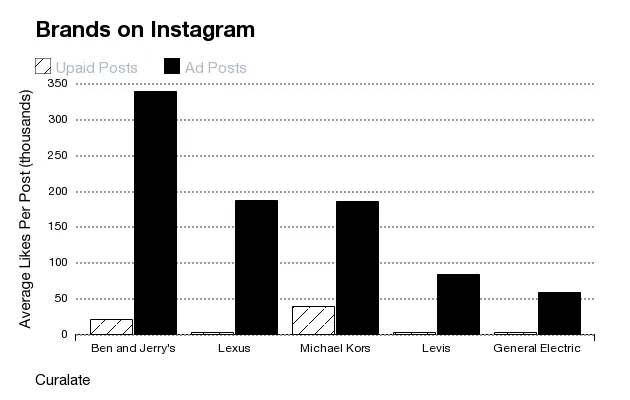 Curalate,一家与希望在社交媒体上做广告的公司合作的机构,查看了Instagram首次推广中包含的五个品牌。如果没有别的,付费广告在吸引点赞方面比同一品牌的未赞助帖子要有效得多,下面的图表显示了这一点: