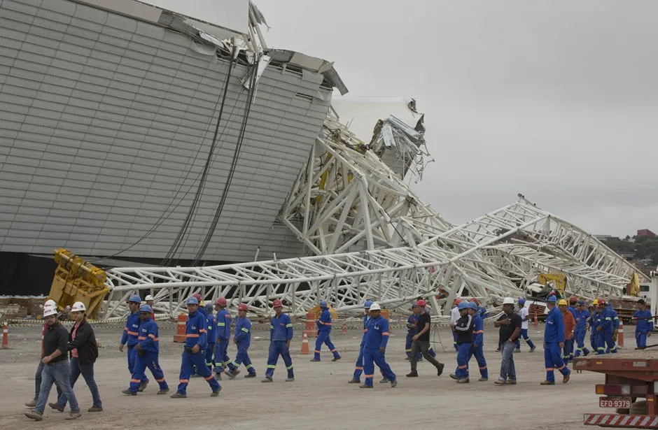 建筑工人在2013年12月2日,星期一,五天前发生事故导致两名工人遇难后,走过科林蒂安竞技场的坍塌造成的损坏,该竞技场将举办世界杯的开幕赛,在圣保罗,巴西。美联社照片/安德烈·佩纳