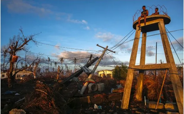 图形由 克里斯·沃克 提供。顶部图片:男人坐在一个结构上,观看2013年11月25日在塔克洛班市的日出,那里是一个被毁坏的地区。(Athit Perawongmetha / 路透社)