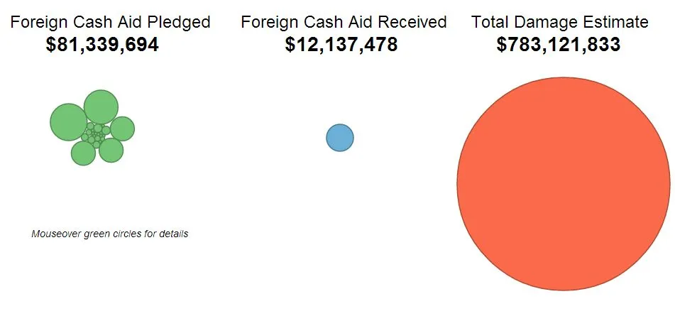 将鼠标悬停在绿色圆圈上,以找到每个国家或组织所承诺的内容。例如,亚洲开发银行提供了2300万美元,而加拿大约为1900万美元,科威特、沙特阿拉伯和阿联酋各自提供了1000万美元。中间的干瘪蓝莓是实际上流入菲律宾的1200万美元。将其与右侧估计的**$7.83亿**的台风损失叠加在一起,就像在面对巨大的太阳时看着地球缩小。