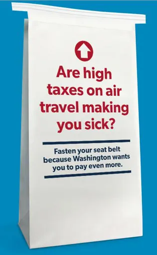 感谢美国航空公司美国航空公司正在利用座椅后口袋中的小呕吐袋来游说反对可能增加的2.50美元的9/11安全费。“高额的航空旅行税让你感到恶心吗?”一个贸易协会,美国航空公司,在呕吐袋上提问,这些袋子本周在华盛顿附近的里根国家机场分发。目标是说服国会议员——尤其是共和党人——认为9/11费用只是另一个名称的税收,而争夺新收入不应该影响航空旅客。