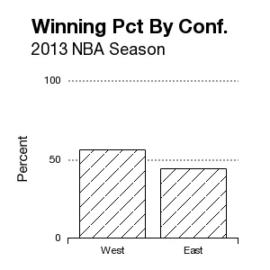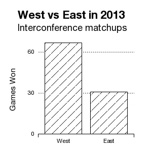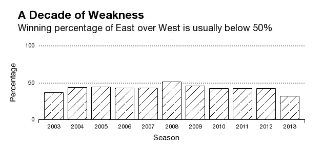 毫无疑问:东部对西部的微薄成功率并不令人惊讶。在过去十年中,东部一直在输给西部。(在过去10年中,NBA总决赛的胜负更为均衡:每个联盟各赢得五场。)