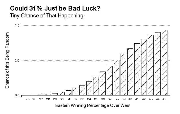 假设43%是东部弱点的“真实”比率,那么今年的32%比率是否表明联盟实力发生了统计学上显著的变化。根据 二项分布,东部仅仅因为随机机会而如此糟糕的可能性不到10%。