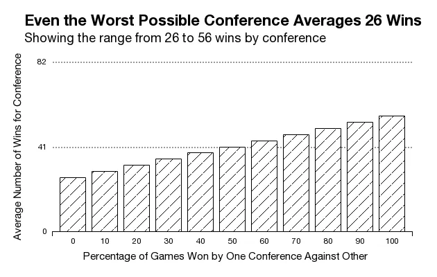 在会议中进行的52场比赛中,平均胜场数至少为26场。即使东部队伍在与西部的每一场比赛中都输掉,他们的队伍仍然会因为相互之间的比赛而平均获得26场胜利。相反,如果西部队伍在与东部的每一场比赛中都获胜,他们的队伍在整个赛季中将平均获得56场胜利。