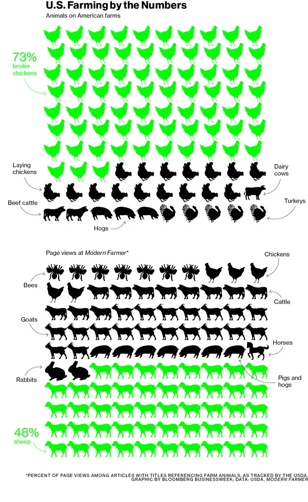 最后这张图表显示了美国农场动物的百分比与现代农夫网站文章标题中动物的百分比的对比。鸡占据主导地位——编辑们坚信它们是进入农业的“入门药物”。“任何人都可以建一个后院鸡舍,”斯威林根说,同时指出“美国的动物数量并不是流行程度的最佳指标。”确实如此:我宁愿选择小羊而不是 圣诞猫。