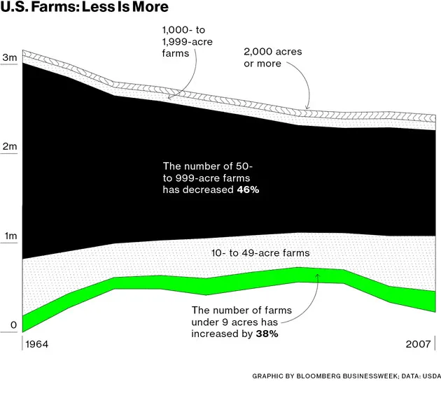 自1964年以来,美国的农场总数一直在减少。然而,近年来,九英亩以下的农场数量有所增加——正如现代农夫所称的“爱好农民”。“希望拥有大约50英亩农田的人数增长显著,”斯威林根说。“非常非常大的农场和非常非常小的农场仍在增长,但中等规模的农场正在被挤出。”
