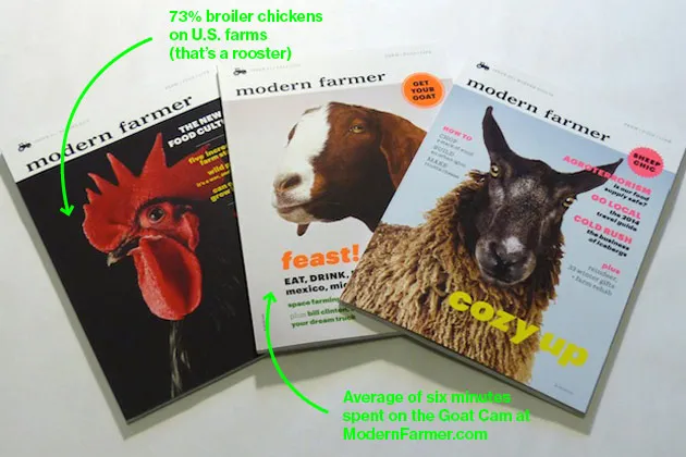 至今登上 现代农夫 封面的有羊和山羊,这些动物吸引着平均年龄为55岁的小型农场经营者。它们也非常可爱——“不可阻挡,”斯威林根说。山羊摄像头产生了60,000次页面浏览,9,000次 Facebook 分享,以及1,500次 Twitter 提及。