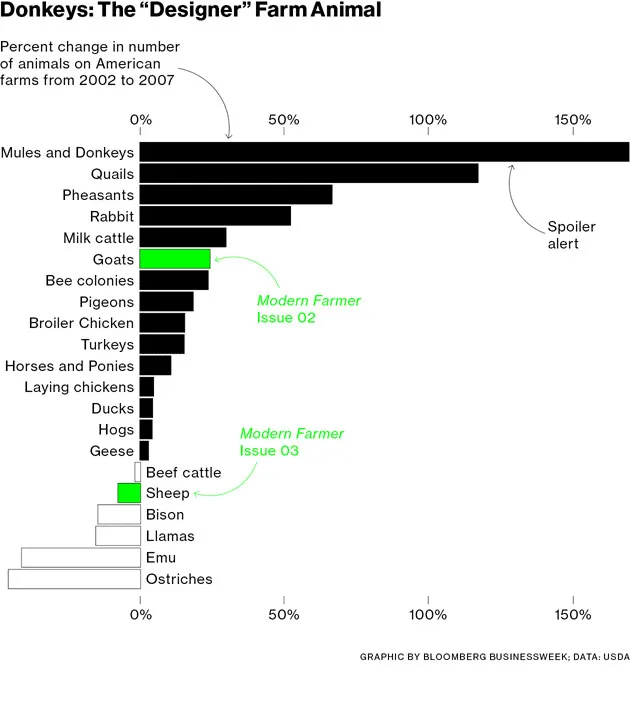 至于农场动物,大多数物种在2002年至2007年间经历了重大增长,但牛和羊等农场宠儿的数量却有所下降。现代农夫 的首席执行官兼主编安·玛丽·加德纳对驴子高居榜首并不感到惊讶,声称它们是“新设计动物。”(剧透:她补充道:“我在我们的未来中看到了驴子。”)