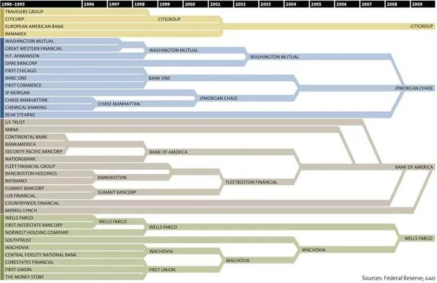 摩根大通的规模相当于整个英国经济,掌握着美国12%的现金。拆开它的公司信头,你会发现许多老牌财富500强企业,如华盛顿互助银行、普罗维登、化学银行、Banc One、贝尔斯登和大西部银行等被吸收的机构。美国银行收购了Countrywide和美林证券(以及几乎所有美林证券收购的公司),占美国商业贷款的约三分之一,而富国银行(想想Wachovia-First Union-CoreStates和Money Store)则占所有抵押贷款的四分之一。