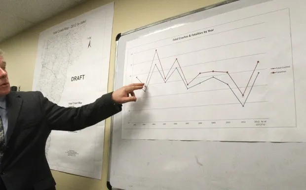 顶部图片:公共安全专员基思·弗林指着一张图表,显示2012年底在佛蒙特州伯灵顿交通死亡人数大幅增加。(美联社照片/托比·塔尔博特)