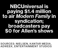 艾伦还惹恼了他原来的圈子:喜剧演员。2012年12月,喜剧演员伯纳黛特·波利和托马斯·克拉克对娱乐工作室提起了两起集体诉讼,试图代表大约400名喜剧演员和演员,针对各种指控,包括未支付重播费(支付给演员的重播费用)。艾伦对这些诉讼没有评论,但对他的精简商业模式没有任何歉意。“我们有一种工厂心态。我们专注于成本、成本、成本,并降低成本,因为我们知道我们花得越多,收视率就必须越高,”他说。“我把我们视为电视界的沃尔玛。” 52岁的艾伦拥有广泛的魅力和轻松的微笑,像是一个大部分时间都在电视上度过的人。他穿着一套宽松的黑色西装,格子衬衫,以及带有银色扣子的黑色绒面乐福鞋。在展示娱乐工作室新租赁的75,000平方英尺的制作空间时,艾伦表示他是从零开始建立自己的帝国,部分原因是作为一名黑人,他必须这样做。“在过去的20年里,我看到我的白人同行获得了大量的资本,而在20年里,没有人给我提供过一分钱,”他说。“这让我变得更强大,让我与不同的学科合作。”