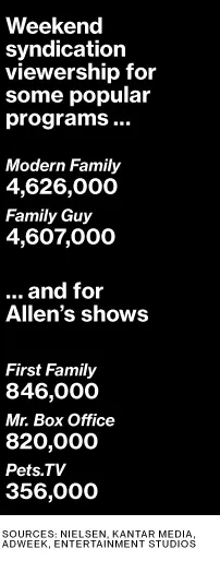 逐渐地,广告商们开始加入。艾伦没有启动资金,也没有贷款,他将自己的收入投入到扩展业务中。他拥有娱乐工作室100%的股份,该工作室积累了超过4000小时的节目库——主要是现实电视节目、脱口秀、喜剧和法庭节目。他每周制作大约10小时的新内容。目前公司有27个节目在播出,包括与拜伦·艾伦一起踢和年轻的偶像,这是一个关于杰出孩子的现实秀。艾伦最受欢迎的作品漫画无极限,这是一个与喜剧演员的脱口秀,去年根据研究公司Kantar Media的数据显示,广告收入达到了1200万美元——尽管根据尼尔森的数据,该节目平均只有241,000名观众,并且已经多年没有录制新剧集。(在纽约,该节目在WCBS的周一至周五凌晨1:37播出,紧接着是克雷格·费格森深夜秀。)