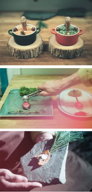 在每晚客人到达之前,Baehrel 会准备一张桌子,上面摆放着用于准备菜单的原材料样品。当他上每一道菜时,这位厨师会讲述其创作的故事,使用树枝和杂草作为视觉辅助。在九月份的一次晚餐中,他端出了一种用松树面粉制成的三角饼干和一堆小榉木蘑菇。他解释说,两年前的春天,他砍倒了一棵松树,并手工去掉树皮,揭开了内外层之间的白色浆状物质。他告诉专注的食客们,他把这些带到温室,经过浸泡、干燥和几乎持续一年的多步骤过程进行腌制。最后,Baehrel 说,他在一个石碗中手工将浆果研磨成粉末。
