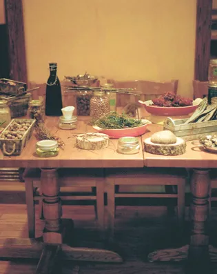 Baehrel对分子美食有独特的见解;他的精致小吃在从草坪到嘴巴的过程中经过脱水、注入和酊剂处理。所有这些工作都在厨师自己建造的红白相间的厨房里进行,厨房看起来像一个乡村客栈。他保持空间一尘不染,每隔几天就铺上塑料布以保护油毡地板。在不锈钢的准备台上摆放着通常的餐厅设备,如搅拌机和食品加工机;整齐的架子上存放着数百个标记清晰的容器,里面装着如粉状蕨类植物或腌制枫叶等精心标记的食材。“有一天我突然想到——这真的是一次顿悟,25年前——我所需要的一切都在这里,”Baehrel说。“而我将用余生来发展和探索可能性。”