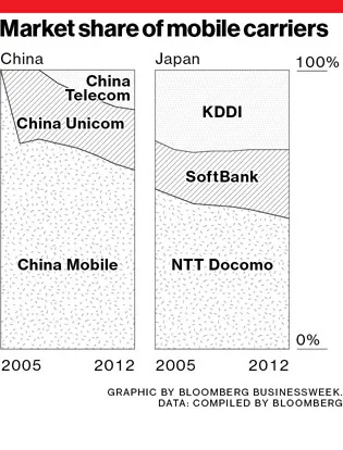 中国移动仍然占据中国移动通信市场的62%,但在过去五年中下降了超过10个百分点。Docomo也经历了类似的下降。作为1990年代末移动互联网的先驱,Docomo一直在不断失去用户给更具竞争力的对手。虽然软银在2008年开始提供iPhone,而 KDDI 在2011年跟进,但Docomo仍然忠于索尼等日本品牌。从2005年起,Docomo的市场份额从超过60%降至47%以下。