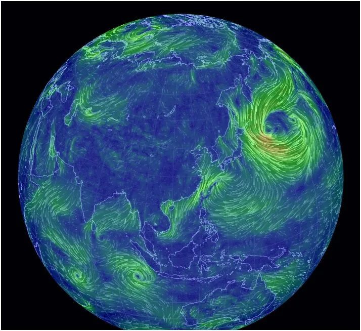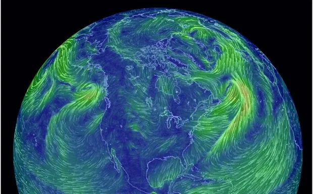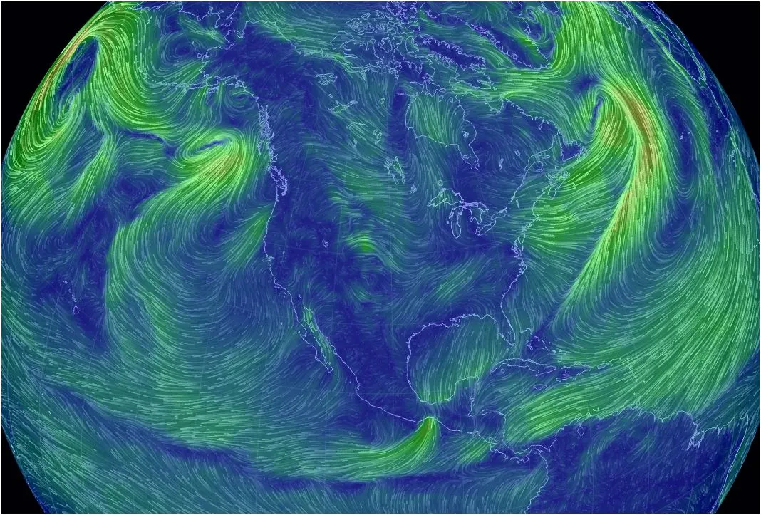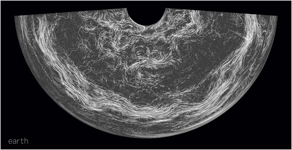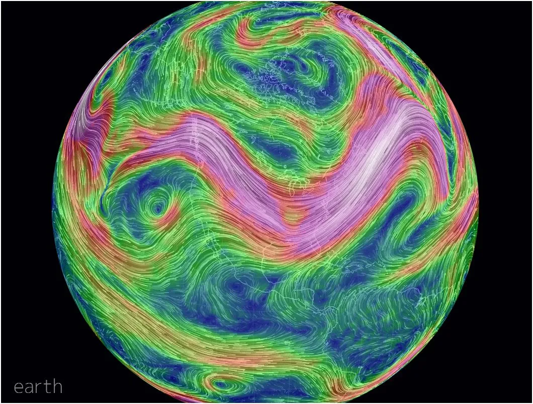 答案在于这个 诱人入迷的模型,它展示了来自 卡梅伦·贝卡里奥 的近实时风模式,贝卡里奥是一位驻东京的软件工程师。对于“地球”,贝卡里奥将 Hint.fm的风图 背后的概念扩展到了全球范围,这个风图展示了美国的气流运动,作为 细长的、蜿蜒的线条。用鼠标抓住地球,旋转和缩放,看看大气的狂热化身:在赤道缓慢漂流的温暖气流,围绕北极打转的冰冷平流层阵风,印度洋扰动将空气扭曲成尖叫的漩涡。