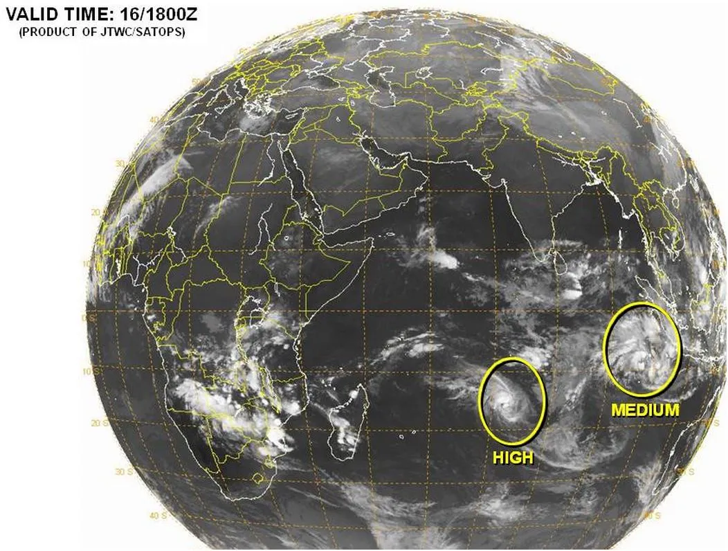 来自 联合台风警报中心 的卫星图像更清晰地展示了这些云雾缭绕的旋转体: