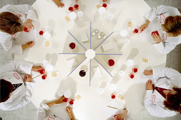 在两个小时的会议中,品尝者坐在看起来像是隔开的学习小隔间(不作弊!)里,配有一台电脑和一个小舱口,通过这个舱口,标有数字标签的样品从墙另一侧的厨房传递过来。她们会得到一个评分卡,以15分制来评估食品的某些属性,从不存在到非常强烈。她们不必吞下去——她们还会得到一个吐痰杯。之后,她们会聚在一起讨论结果。