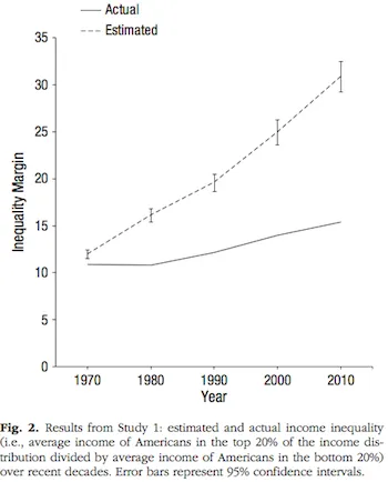 但是不平等本身呢?一种概念化它的方法是考虑顶层20%的人与底层20%的人相比,赚得多少。根据五分位数来看,1967年最富有的20%赚得是最贫穷的20%的11.13倍。研究参与者被告知这一点,然后被要求估计自那时以来每十年间这一差距是如何变化的。到2010年,人们平均认为,人口的前五分之一现在赚得是底层五分之一的30倍以上。根据这一指标(尽管这是衡量不平等的众多可能方式之一),实际差距更像是15.5倍。