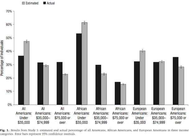 人们始终高估了年收入低于35,000美元的家庭数量,并低估了年收入超过75,000美元的家庭数量,包括在按种族划分问题时。人们认为几乎一半的美国家庭(48%)年收入低于35,000美元。真实的答案是37%。
